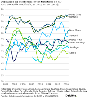 A nivel de destino turístico regional, Punta Cana es el líder en ocupación promedio con más de 85%, seguido por La Romana y Bayahibe, con casi 84%. Como se aprecia en la gráfica, el crecimiento de esta zona es evidente cuando inicia la recuperación económica mundial luego de la crisis financiera internacional del 2007-2008.